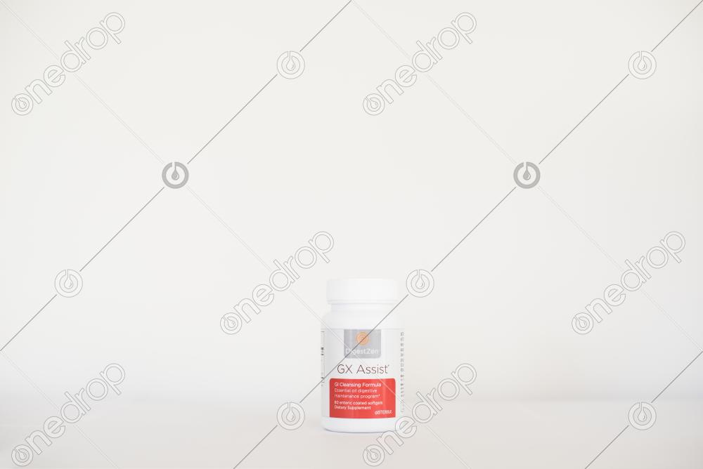 A high resolution horizontal .jpg digital download photograph of a bottle of DigestZen GX Assist with a white background. Image can be used on Facebook, Instagram, Pinterest, other social media outlets, in pamphlets, magazines, or business cards.