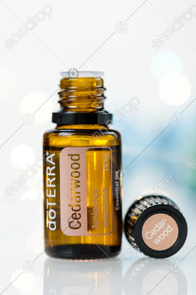 Bottle of essential oil Cedarwood on Christmas decoration and lights garland background
