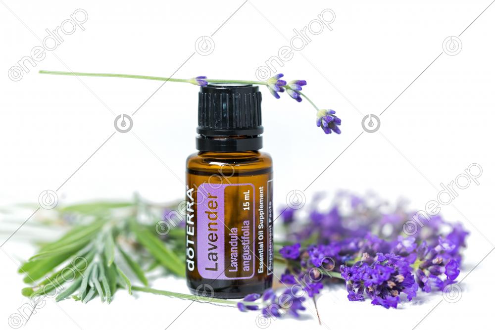 Bottle of essential oil dōTERRA Lavender, copy space