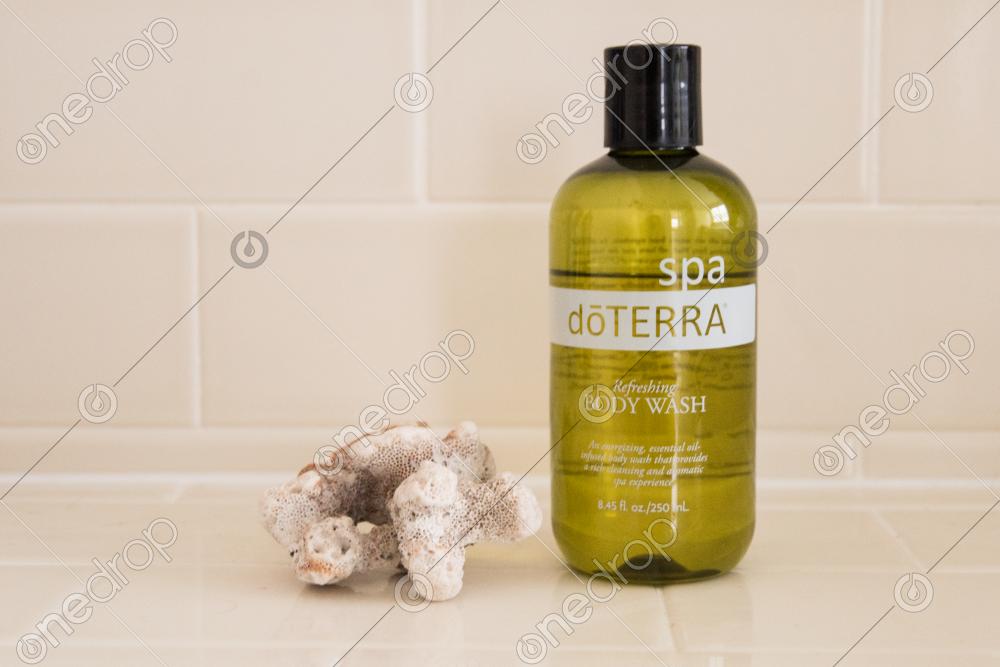 A high resolution .jpg digital download of a spa refreshing body wash bottle on a light cream colored tile background with a piece of coral. Image can be used on Facebook, Instagram, Pinterest, other social media outlets, in pamphlets, magazines, or business cards.