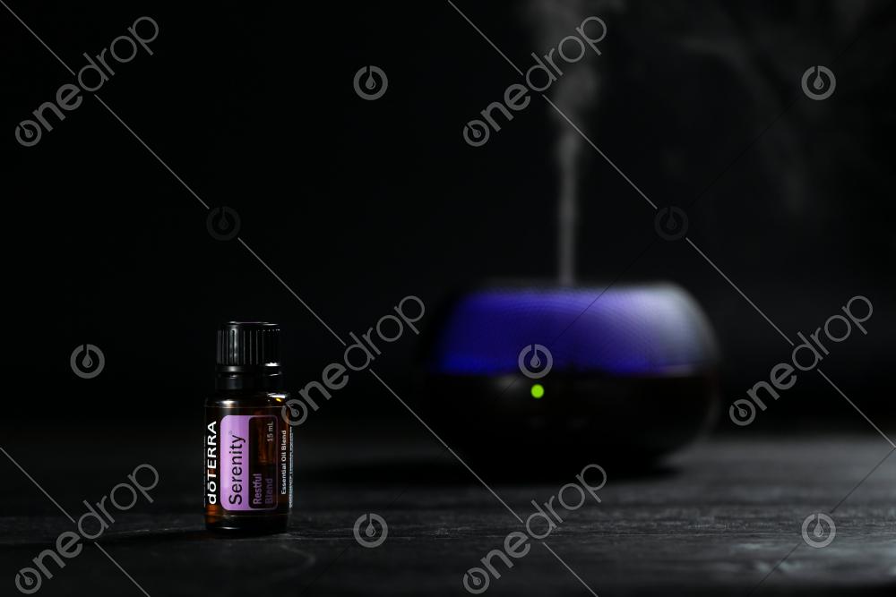 Bottle with Calming essential blend dōTERRA Serenity and Brevi Diffuser on dark background