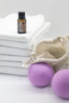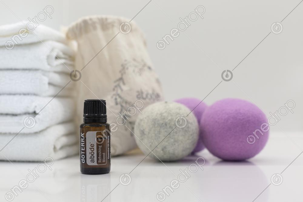 Bottle with essential blend Abode 15 ml on dryer balls background, bundle