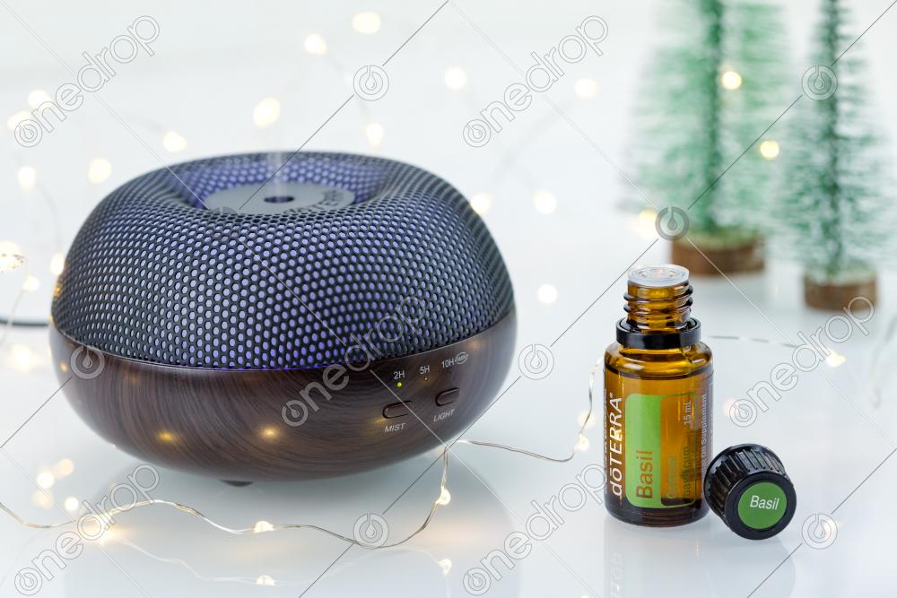 Bottle with essential oil Basil with misting diffuser Brevi on white