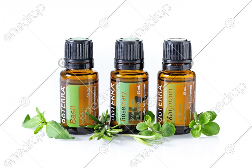 Bottle with essential oil Basil, Rosemary and Marjoram decorated fresh herbs on white. Aroma culinary concept. Macro shot