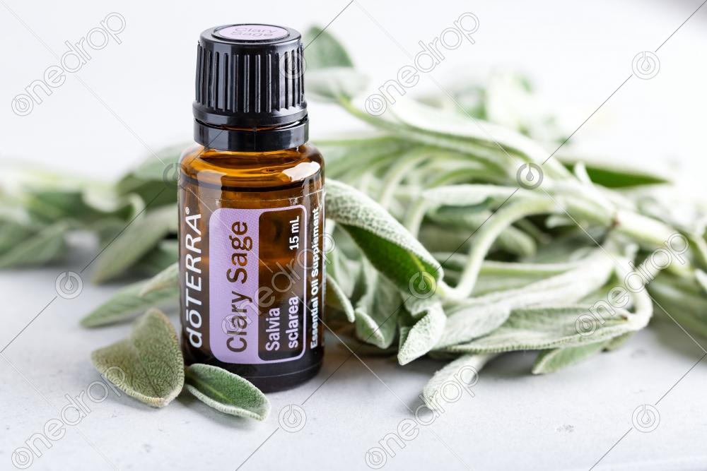 Bottle with Essential oil Clary Sage on white background