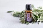 Bottle with Essential oil Clary Sage on white background with sage leaves