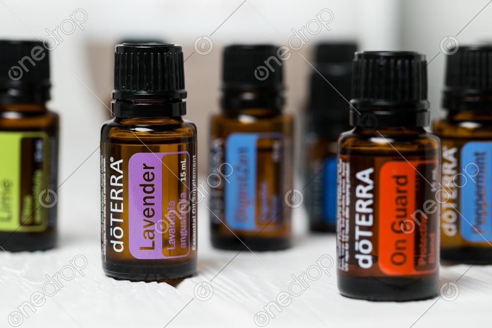 Bottle with essential oil dōTERRA Lavender close to another different oils