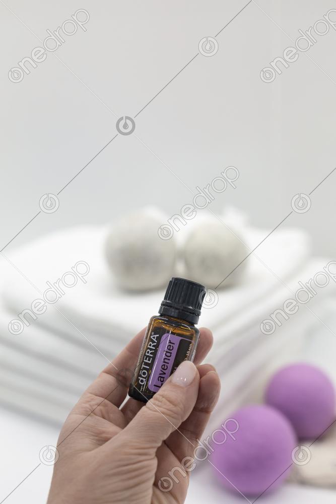 Bottle with essential oil Lavender 15 ml on dryer balls background