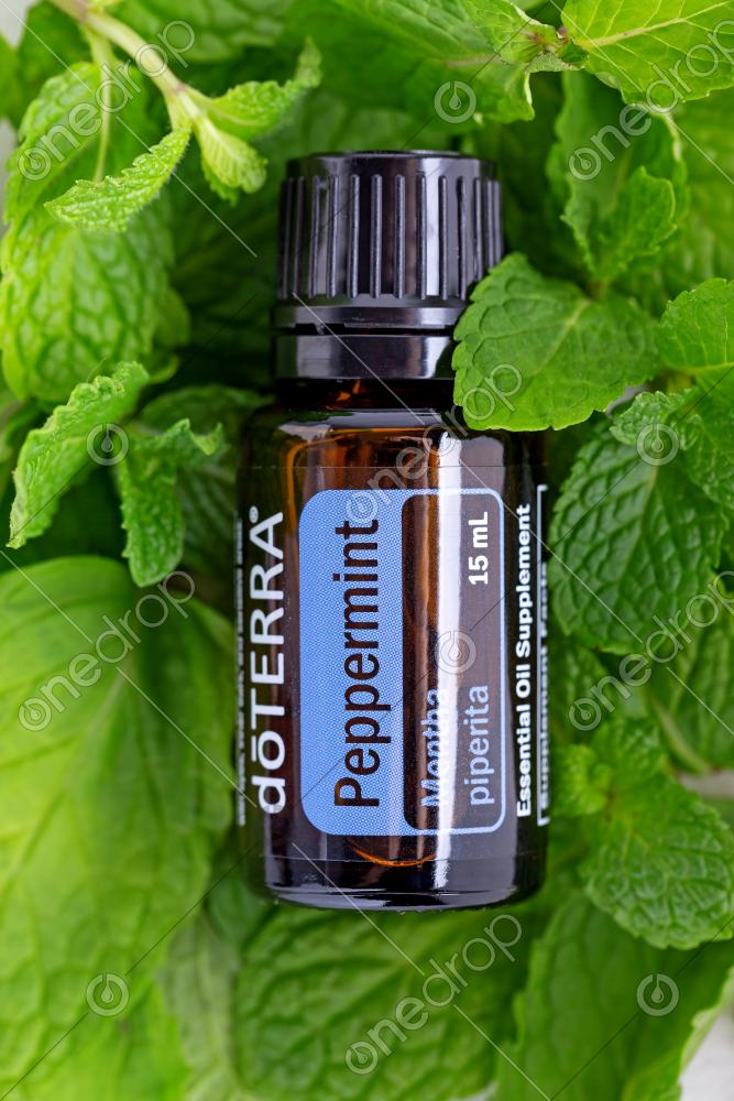 Bottle with essential oils of dōTERRA Peppermint on fresh green mint leaves, top view