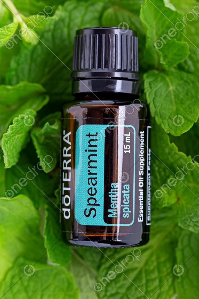 Bottle with essential oils of Spearmint on fresh green mint leaves
