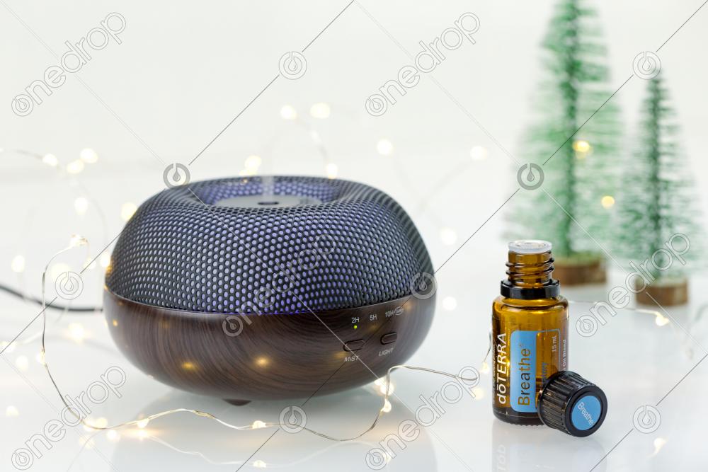 Bottle with essential respiratory blend Breath with misting diffuser Brevi on white