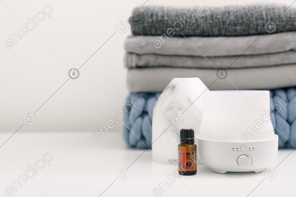 Bottle with On Guard protective essential blend on table and white Diffuser VOLO, decorated warm grey knit plaid. Cozy fall season in interior, copy space for your text