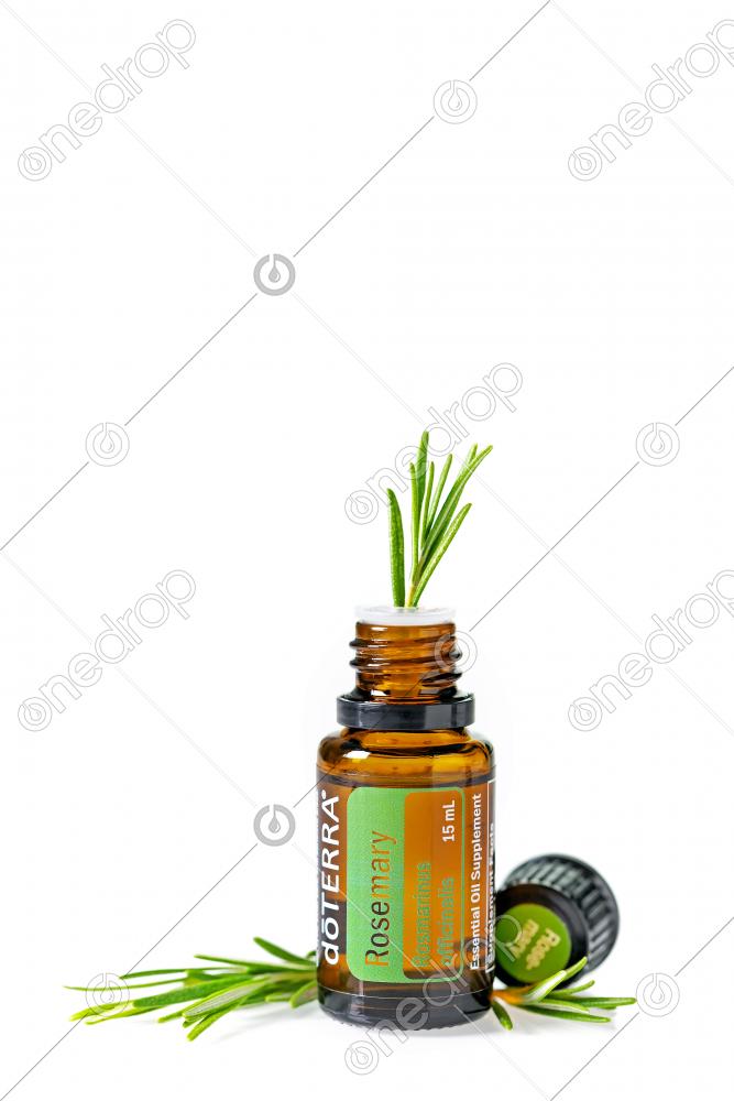 Bottle with Rosemary essential oil with fresh herbs isolated on white, macro