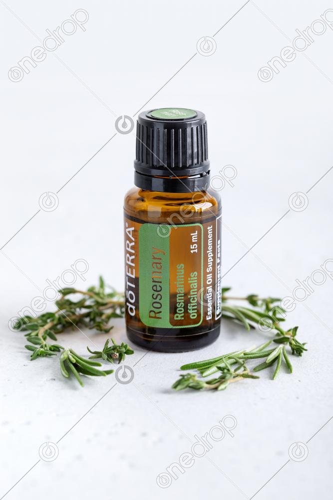 Bottle with Rosemary essential oil with herbal sprigs on white, macro