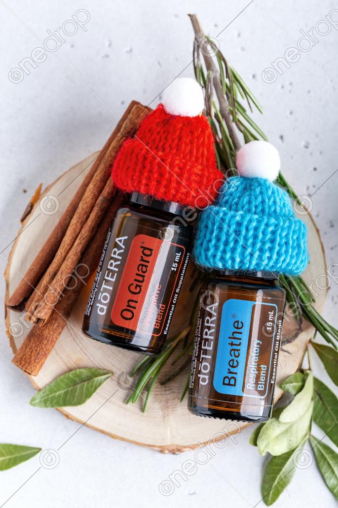 Bottles with essential blends On Guard and Breathe in small knit hats on wood, decorated rosemary and eucalyptus twigs with cinnamon