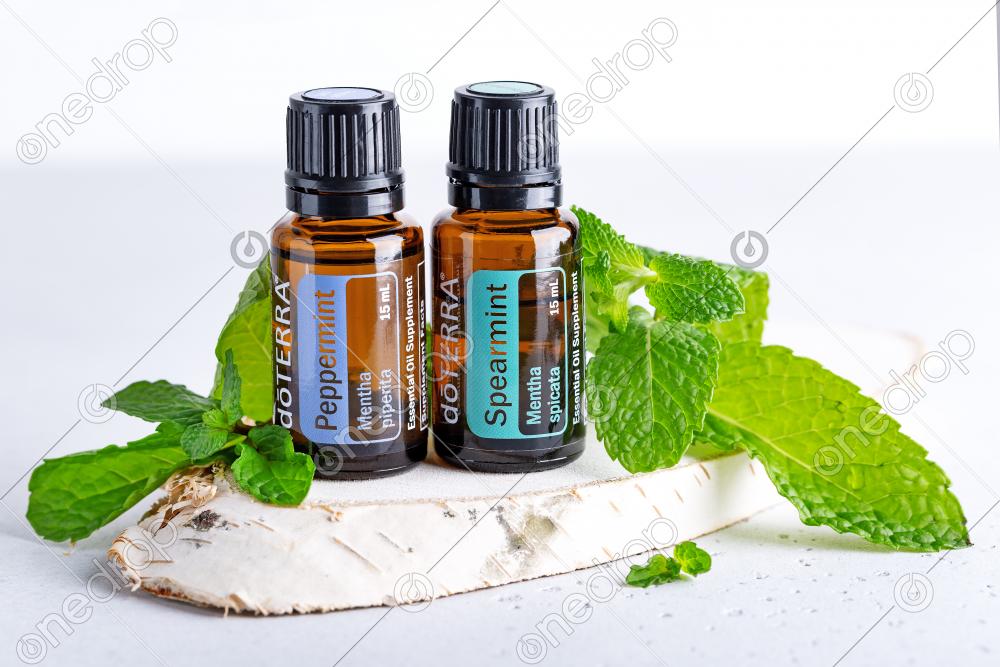 Bottles with essential oils of dōTERRA Peppermint and Spearmint