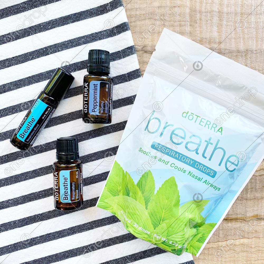 Features Breathe Touch Roller, Breathe (15ml), Peppermint (15ml) & Breathe Respiratory Drops in a Flat Lay.