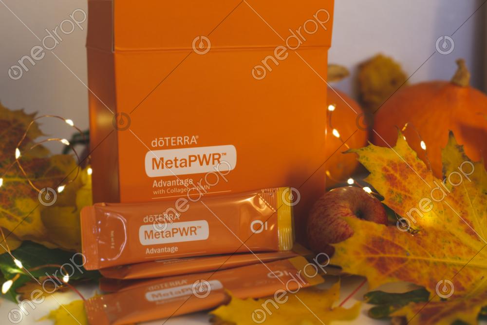 Pack with MetaPWR Advantage Collagen in autumn season interior. Metabolic support concept