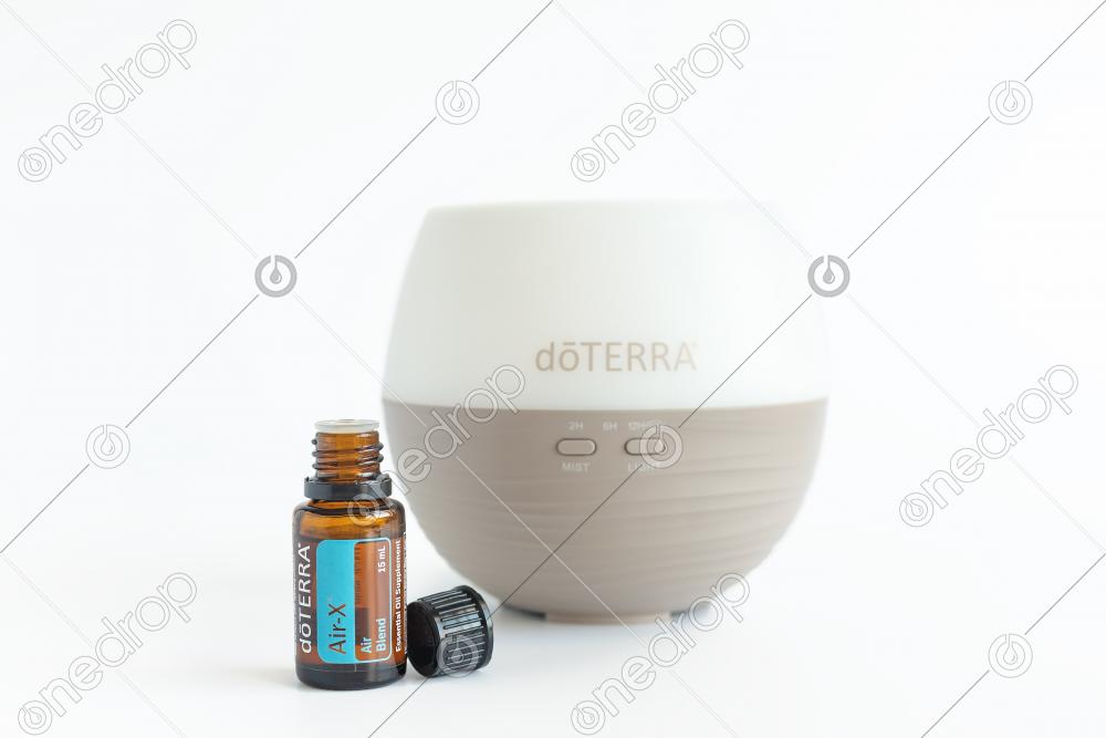 Bottle with essential blend Air-X™ and diffuser Petal 2.0 on white background
