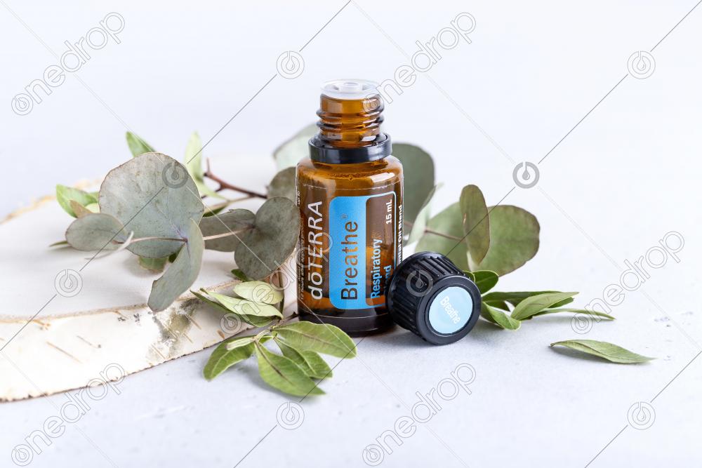 Bundle - Bottle with essential blend dōTERRA Breathe with eucalyptus leaves.
