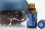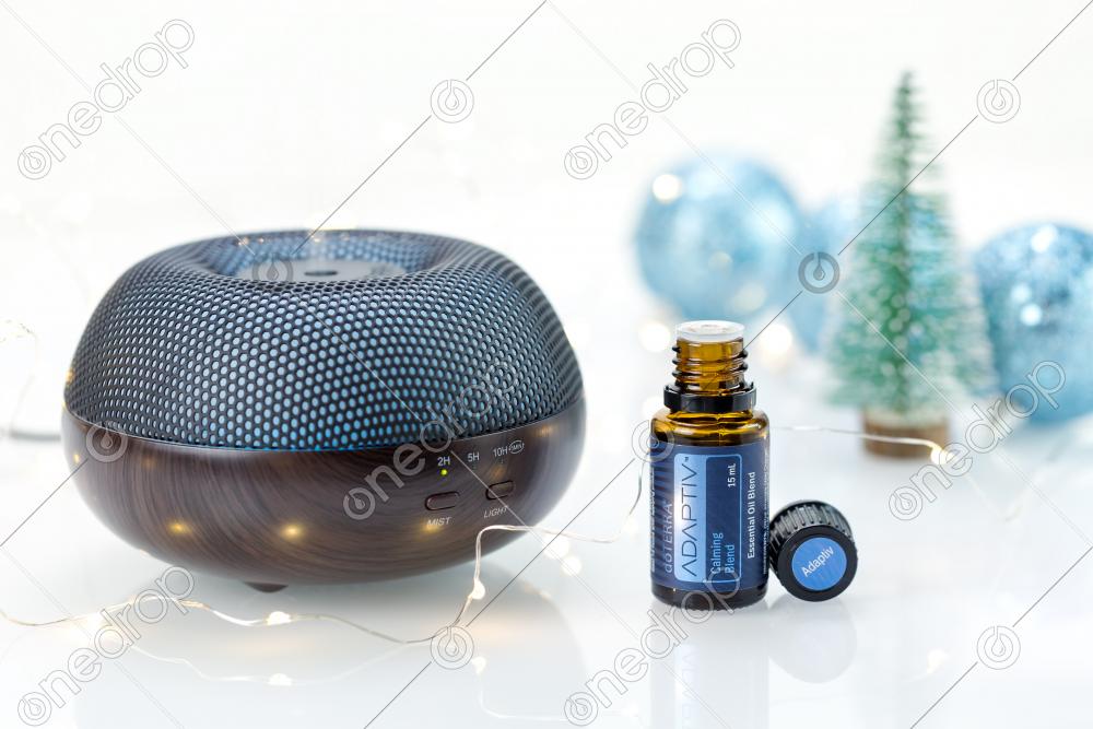Bottle with essential calming blend Adaptiv with misting diffuser Brevi on white.