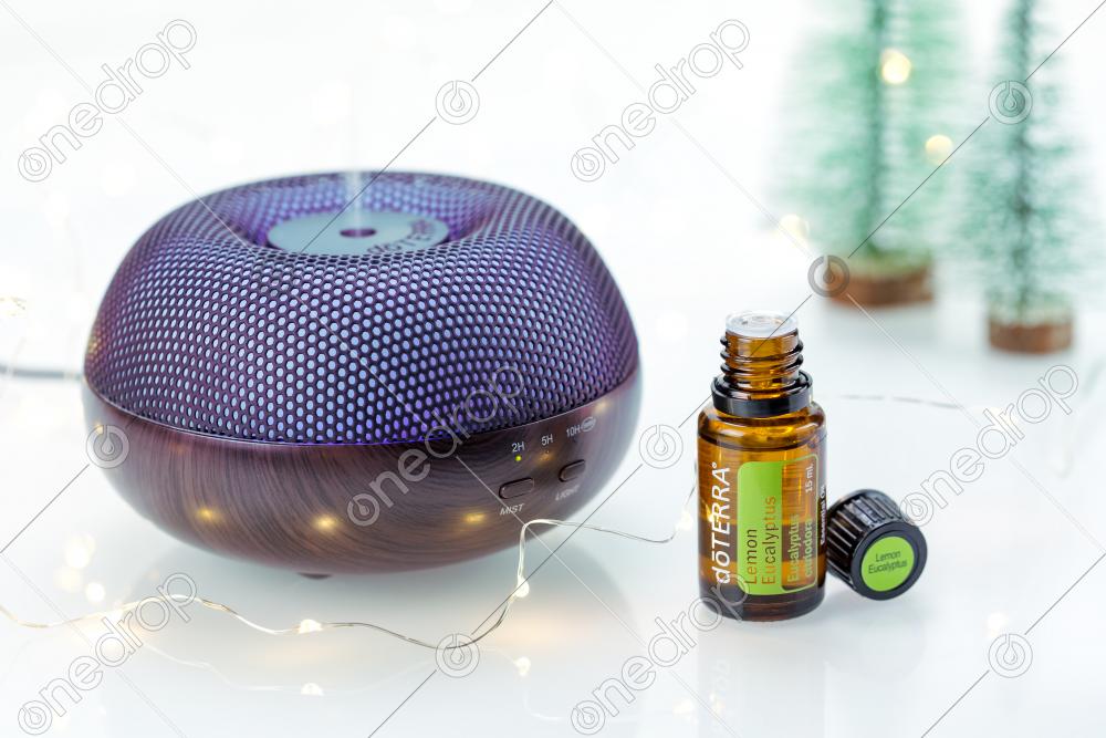 Bottle with essential oil Lemon Eucalyptus with misting diffuser Brevi on white