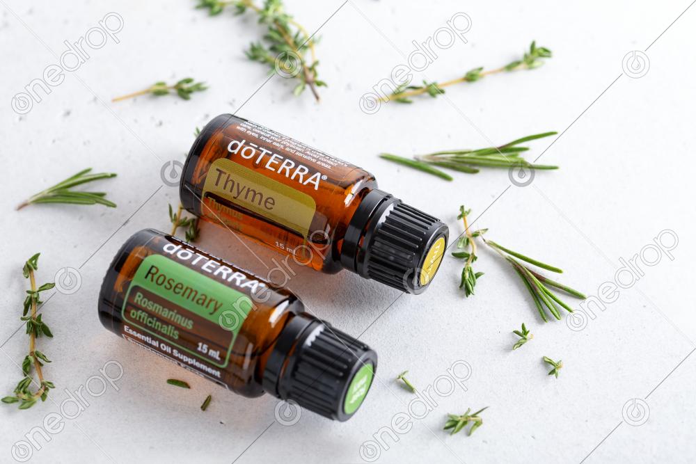 Bundle of 2 images - Bottle with essential oils Rosemary and Thyme