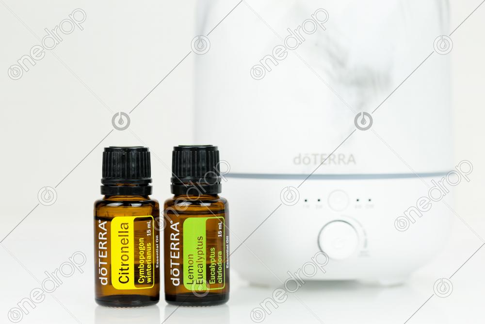 Bottles Essential Oils of Citronella and Lemon Eucalyptus with Diffuser VOLO on white background