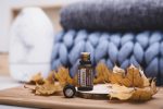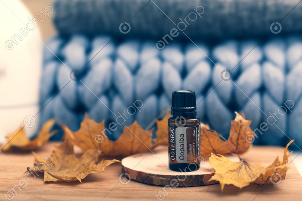 Bottle 15 ml with Copaiba essential oil on wood, decorated maple leaves.