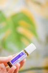 Calmer® 10 ml touch on yellow flower background with yellow flowers and leaves. Blank space can be used to add text or high resolution image can be cropped creatively for Instagram, Facebook, or social media.