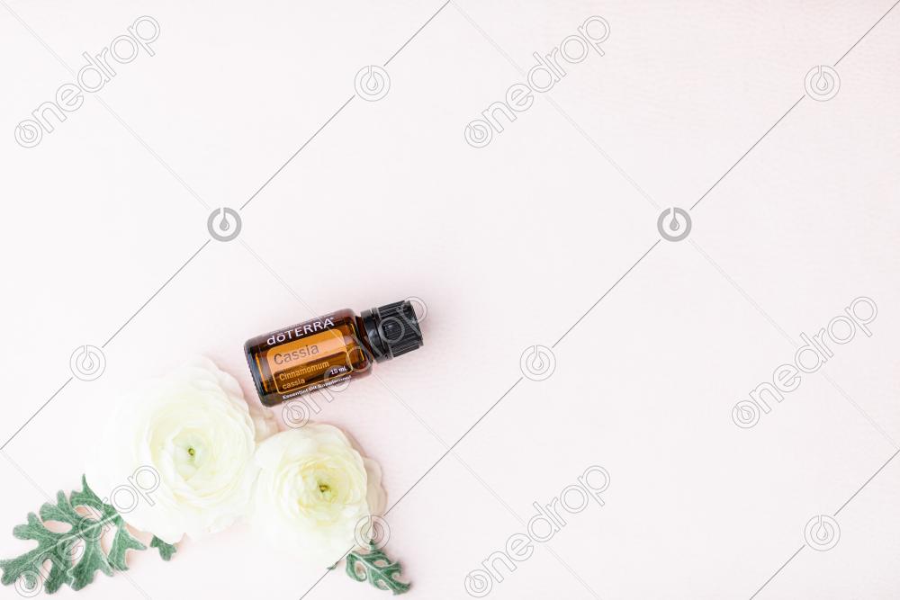 Cassia 15 ml on pink background with white flowers and leaves. Blank space can be used to add text or high resolution image can be cropped creatively for Instagram, Facebook, or social media.