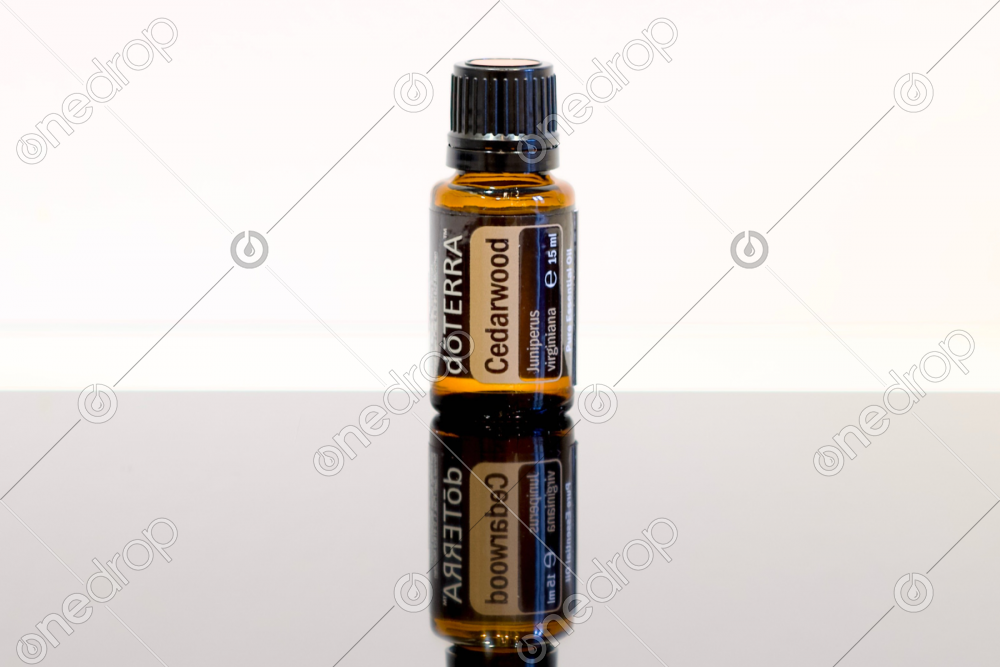 High-resolution photo with Cedarwood 15mL oil bottle on a mirrored surface.
