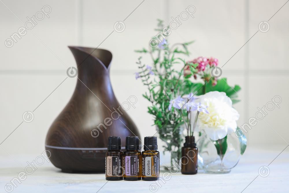 Cedarwood, dōTERRA Lavender and dōTERRA Copaiba with diffuser and fresh flowers