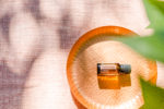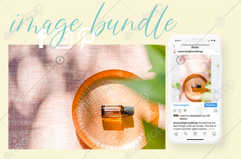 Cedarwood 15ml Essential Oil image bundle on pink linen background with plant leaves. Blank space can be used to add text or high resolution image can be cropped creatively for Instagram, Facebook, or social media.