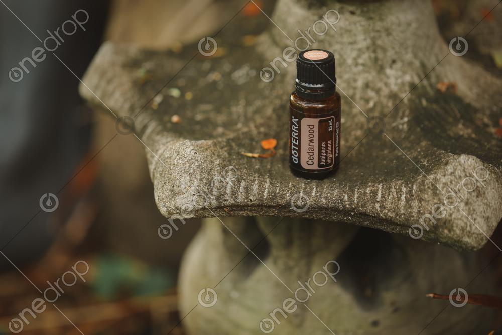 A high resolution image of Cedarwood - The Oil of Community- 15ml full sized bottle on ceramic statue