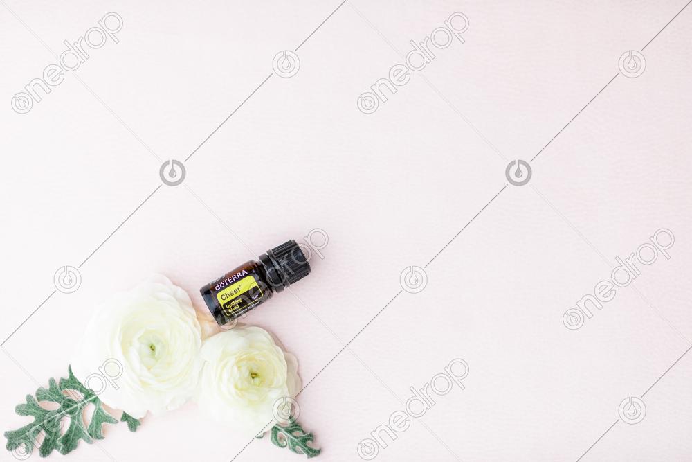 Cheer® 5 ml on pink background with white flowers and leaves. Blank space can be used to add text or high resolution image can be cropped creatively for Instagram, Facebook, or social media.