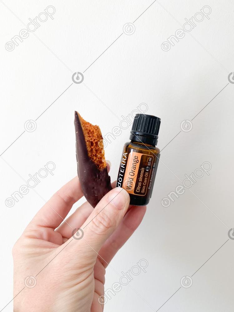 A hand holding a piece of Honeycomb Chocolate and Wild Orange