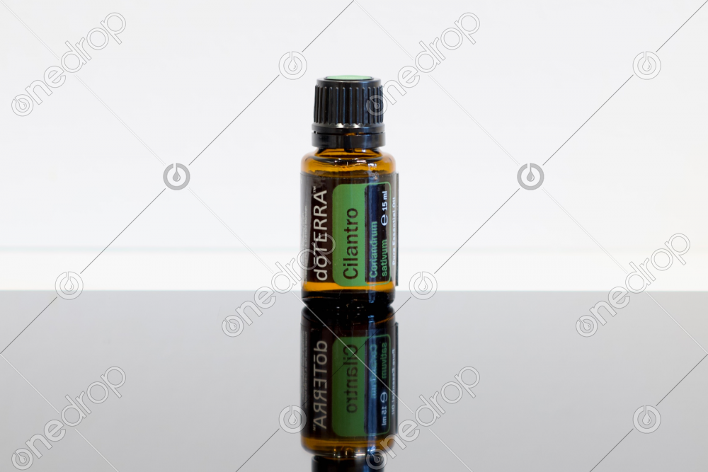 High-resolution photo with Cilantro 15mL oil bottle on a mirrored surface.