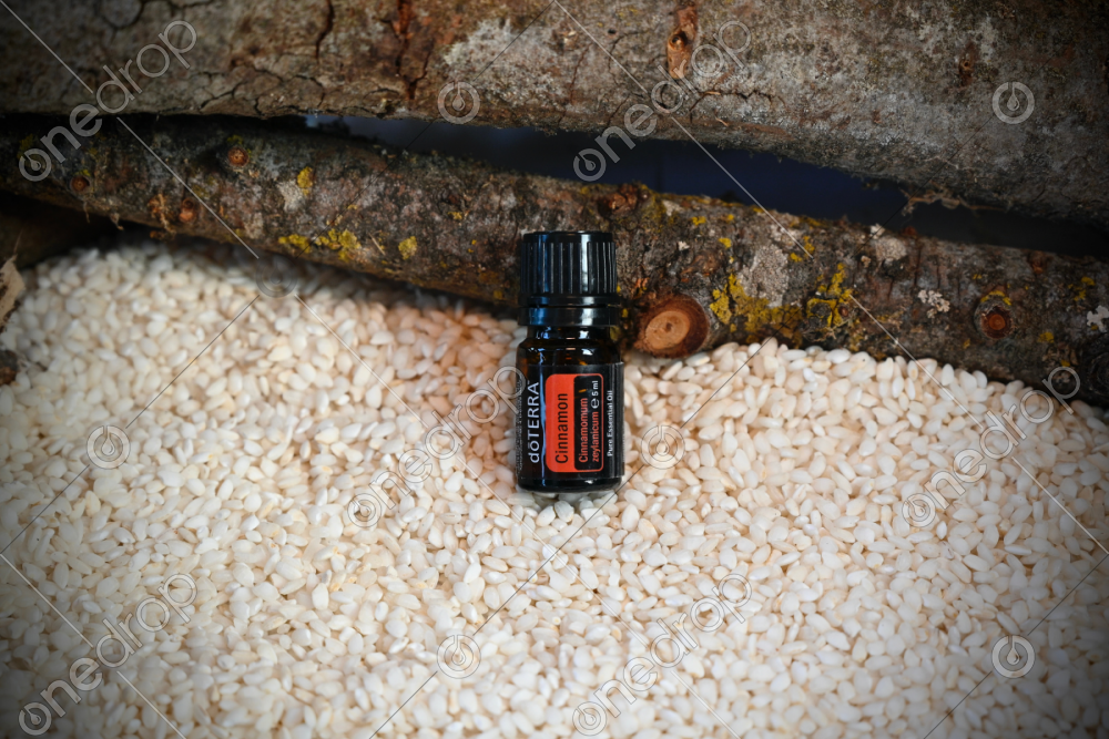 High-resolution image of Cinnamon 5 ml bottle on a woody background