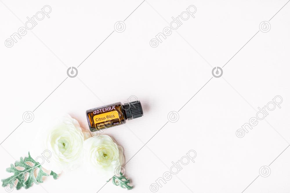Citrus Bliss® 15 ml on pink background with white flowers and leaves. Blank space can be used to add text or high resolution image can be cropped creatively for Instagram, Facebook, or social media.