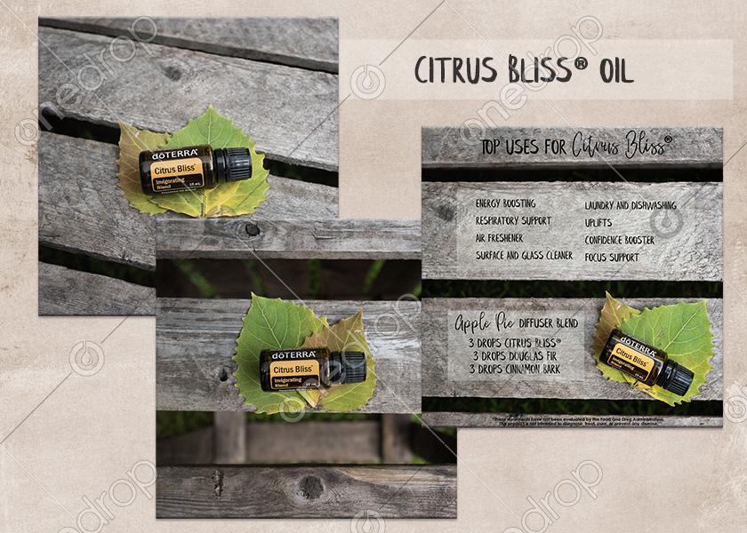 Citrus Bliss Invigorating Blend merges the benefits of citrus essential oils, expertly combining the powerful essences of Wild Orange, Lemon, Grapefruit, Mandarin, Bergamot, Tangerine, and Clementine with a hint of Vanilla Absolute to form this unique and harmonious blend. Citrus Bliss has natural, potent compounds with cleansing properties. Mixed with water, Citrus Bliss is a perfect solution for wiping down countertops and other surfaces while producing a fresh, sweet scent. Diffuse Citrus Bliss throughout the home or office to help create a positive atmosphere while adding a refreshing aroma to the air.