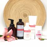 - 5 piece square images with white background, white towel, gold accessory and pink hibiscus flower