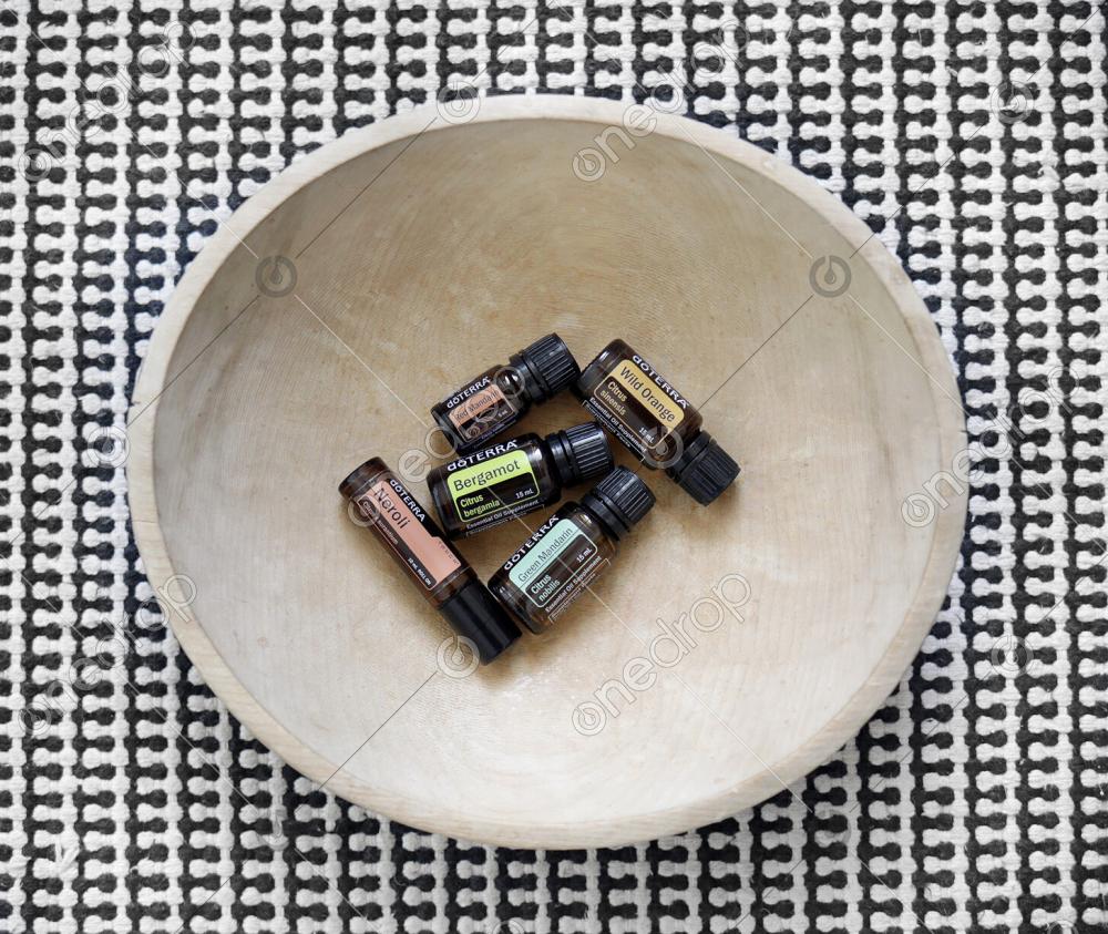 A variety of citrus oils in a wooden bowl on a black and white background. Featuring 10ml Neroli roller, 5ml Red Mandarin, 15ml Green Mandarin, Wild Orange and Bergamot. Lifestyle, in-home style image for social media marketing.