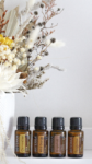 Image of 4 citrus oils with a dried floral arrangement on a white shelf: Tangerine, Clementine, Wild Orange & Grapefruit