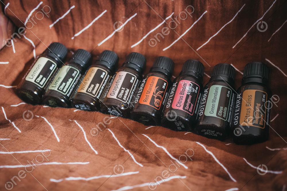This photo features 15 ml bottles of Lemon, Lime, Wild Orange, Grapefruit, Red Mandarin, Citrus Bloom, Green Mandarin, and Citrus Bliss on rust color textured mudcloth