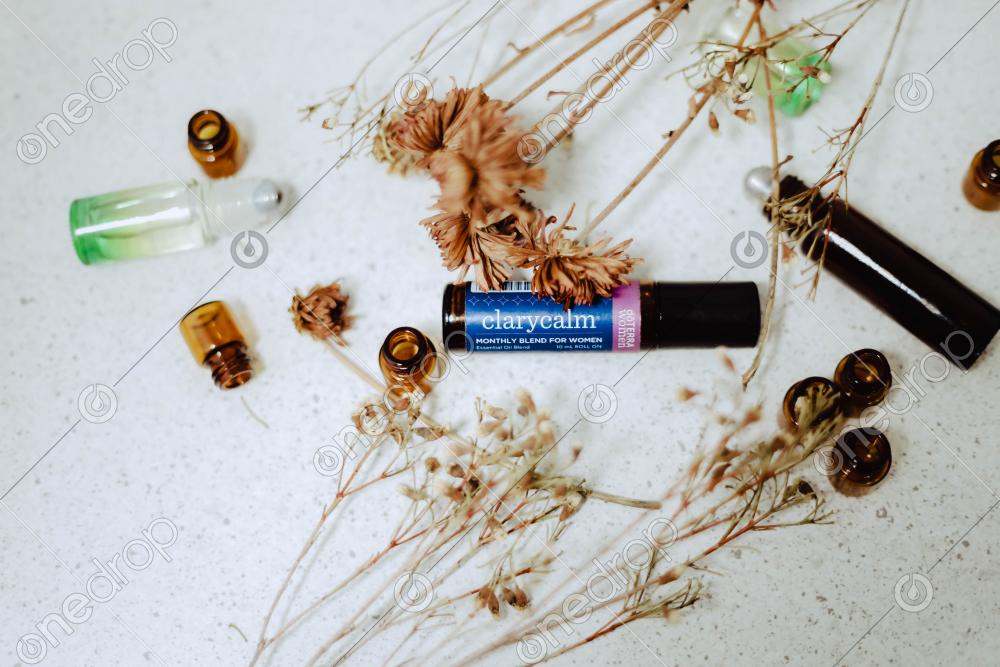 Clary Calm Roll On surrounded by empty vials and dried flowers