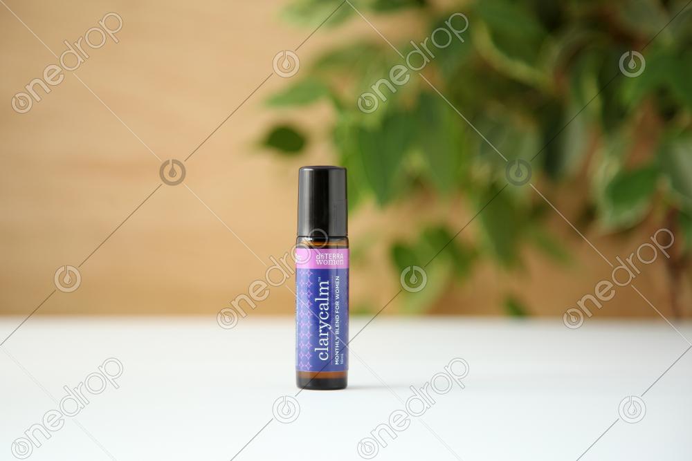 High-Resolution product photograph of ClaryCalm® 10ml roller bottle with a green leaf and wooden background.