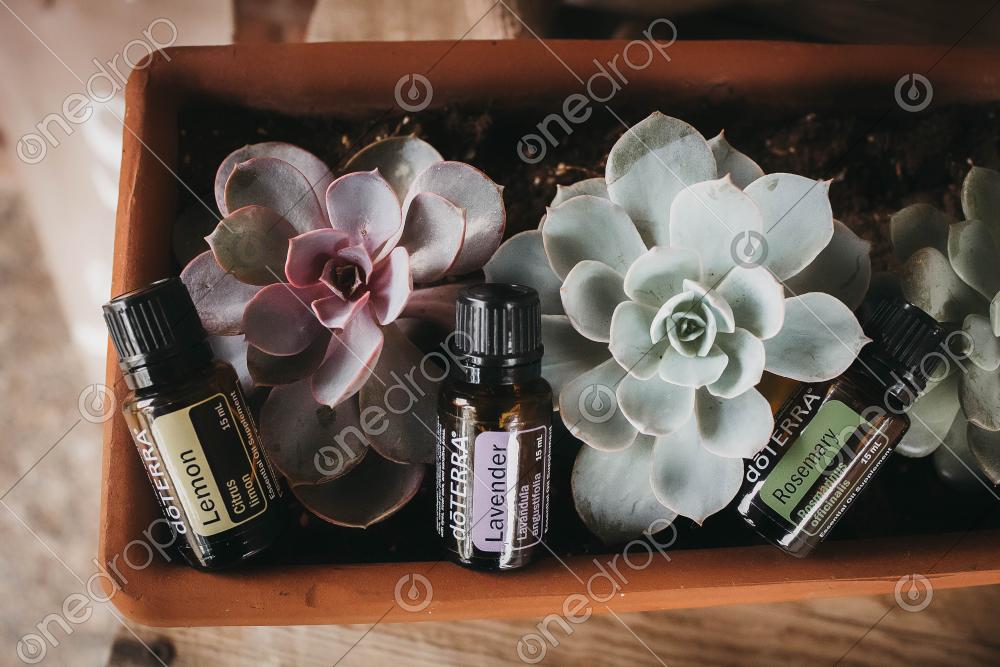 This photo features 15 ml bottles of Lemon, Lavender, and Rosemary with succulents