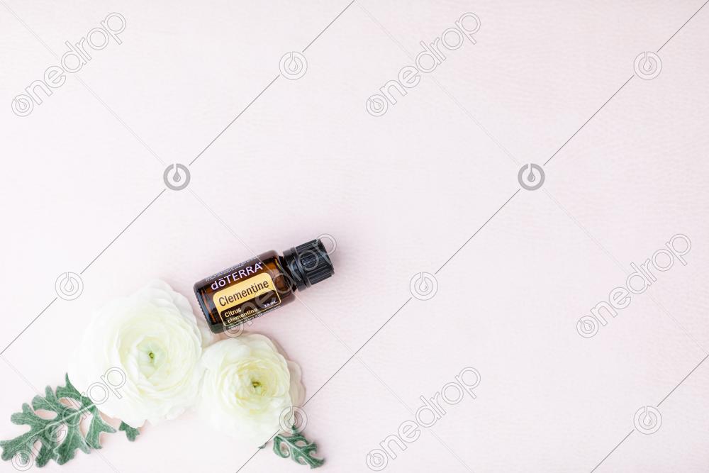 Clementine 15 ml on pink background with white flowers and leaves. Blank space can be used to add text or high resolution image can be cropped creatively for Instagram, Facebook, or social media.