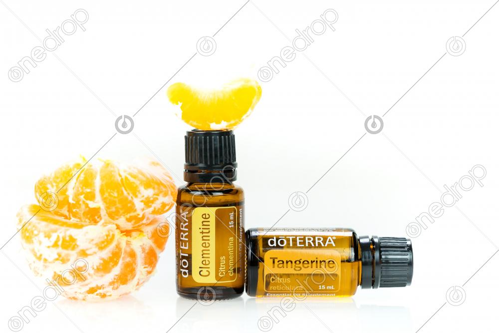 Clementine and Tangerine Essential oils in 15ml bottle with citrus fruits on white background